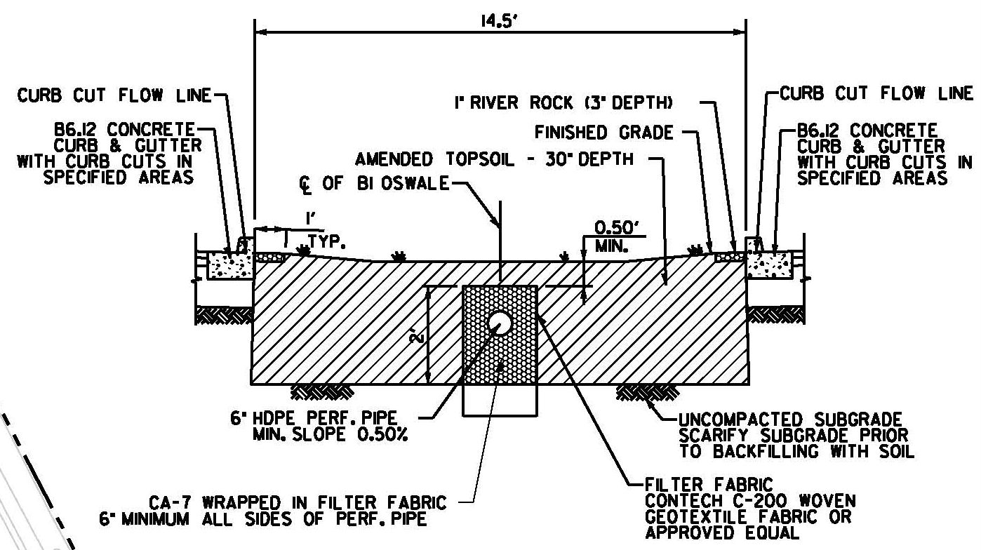 Parking Lot Bioswale Detail (PDF) Parking Lot Bioswale at Hubble Middle School | Bioswale at Blanchard Alliance Church Infiltration Trench at the Hubble Middle School |
